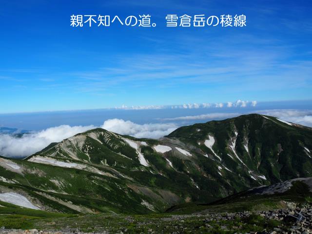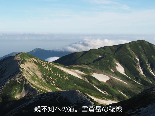 最終4日目、朝日岳は叶いませんでした。三国境から延びる親不知への山々は北アルプスの荒々しさを撫で鎮めるような印象です。途中、ポツンと稜線にある雪倉岳避難小屋がさらに静けさを誘っています。大雪渓登山口の猿倉側に切れ堕ちた白馬岳から小蓮華山への稜線に、NHKの大河ドラマ「坂の上の雲」のオープニングをちょっと味わえたかなと思いました。