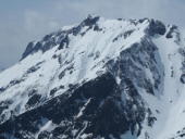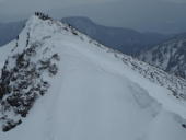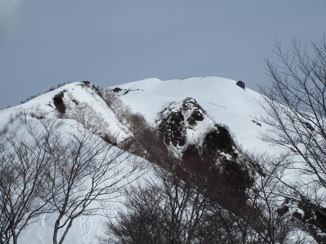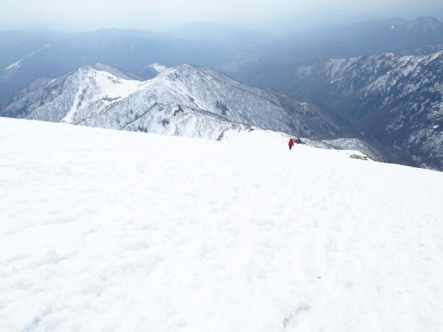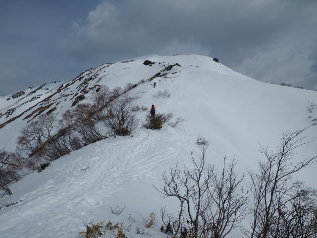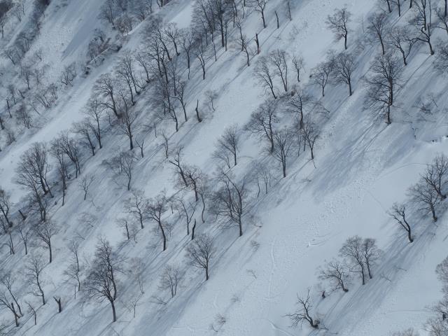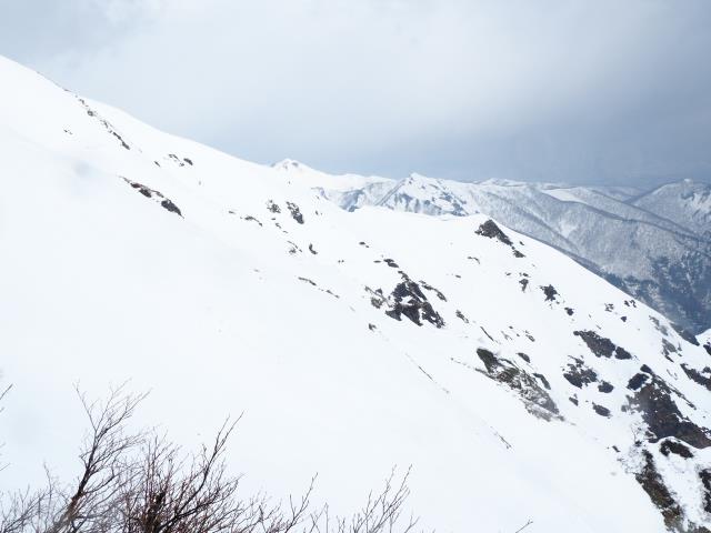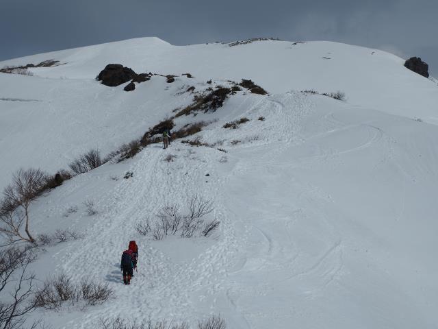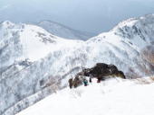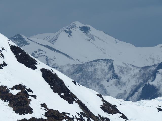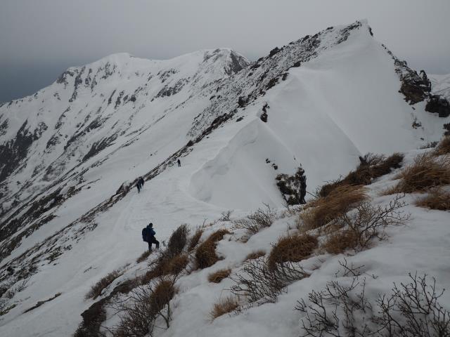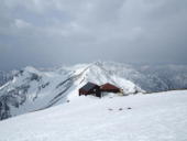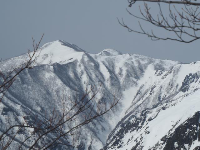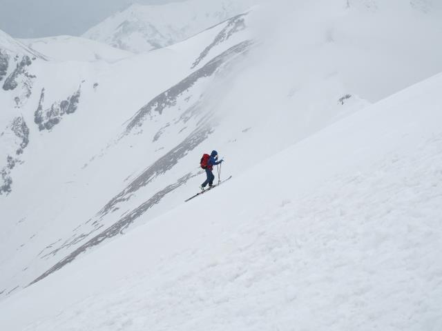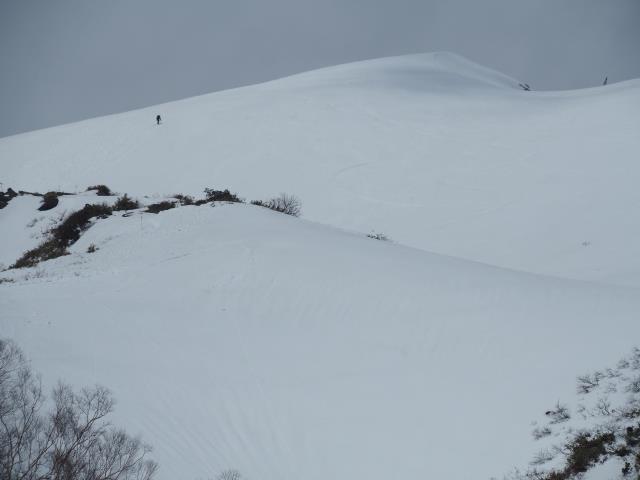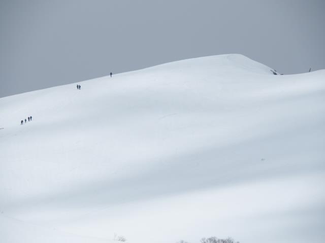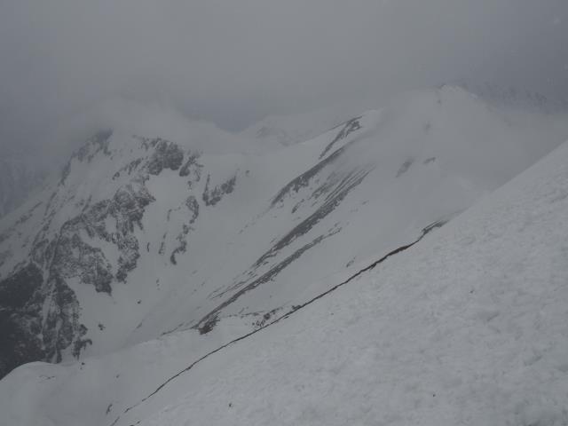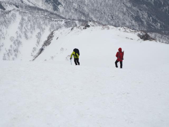トマノ耳の休息もそこそこに張り出した雪庇を避けながらオキノ耳へ。どうも天気予報は外れた様です。下山、大障子ノ頭から俎ーの稜線に風に煽らた雪は白煙と一気に押し寄せホワイトアウト。天気を恨みながら中腹まで下り振り向けば、そんなことは無かったように山が広がている。慌てて下りることもなかったか。