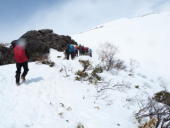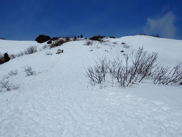 天神平ロープウエイを降り、冬道の天神尾根へ。熊穴沢避難小屋はすっぽり雪のはずが、三分の一も出て今年の雪は本当に少ないです。
